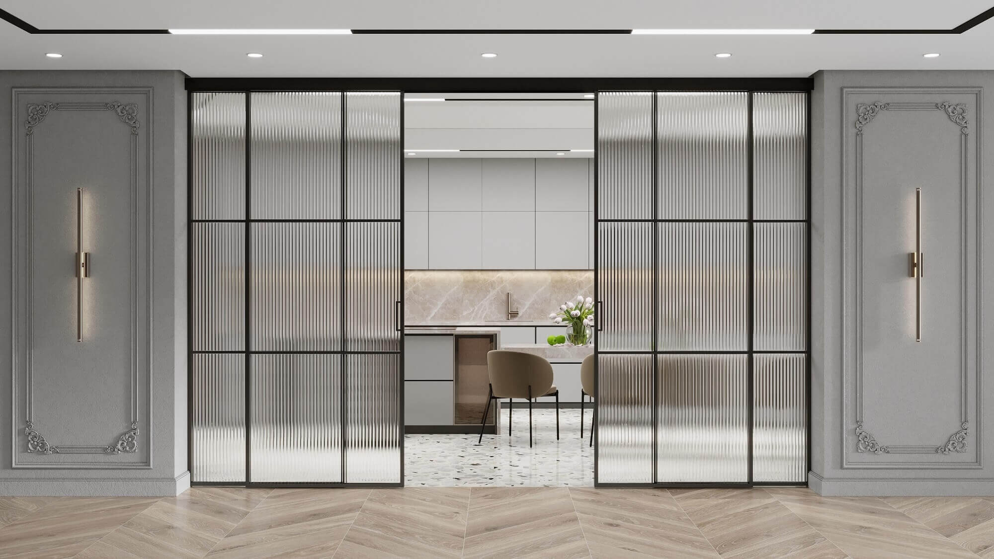 Подвесная раздвижная система - Решить вопрос зонирования в одном помещении позволяет раздвижная межкомнатная система. Чаще других моделей выбирается стеклянная перегородка. Она не только разделяет на зоны, но и пропускает естественный солнечный свет на всю площадь комнаты.